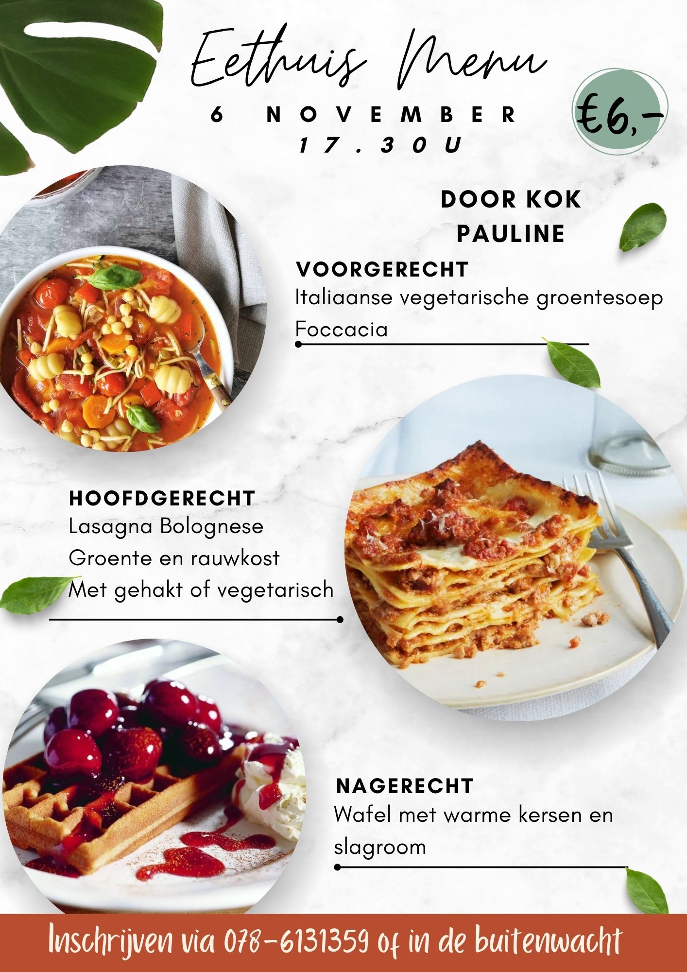 | donderdag | 17:30 | eethuis | € 6,- | Aanmelden |