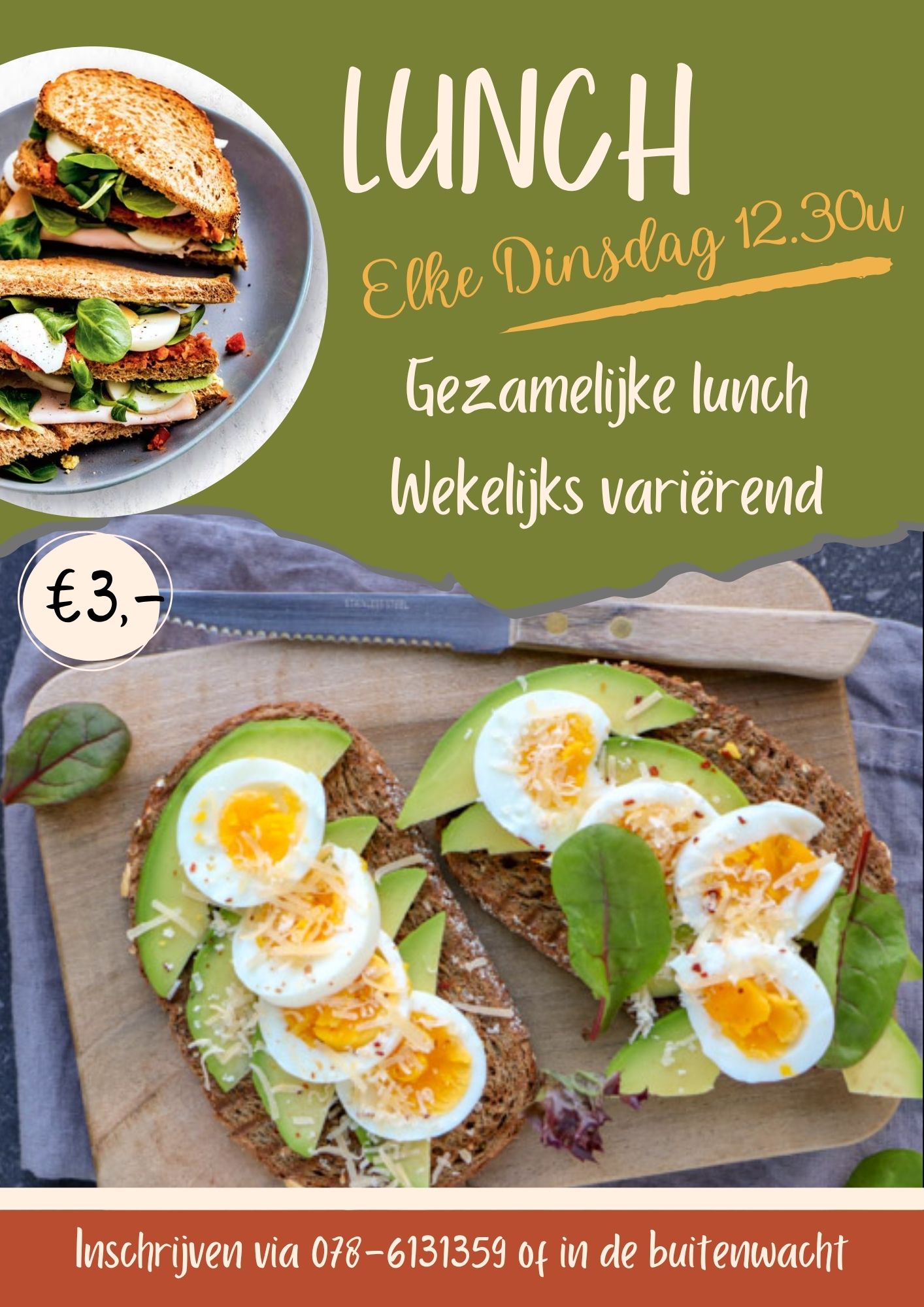 Iedere dinsdag om 12:30u wordt er, op afspraak, in De Buitenwacht een lunch verzorgd die gezamenlijk wordt genuttigd. Elke week staat er wat anders op het menu. Van broodjes kip kerrie tot een omelet of zelfs pannenkoeken. De maaltijden worden vers bereid en er wordt rekening gehouden met voorkeuren, als dat mogelijk is. Iedere week zijn er gemiddeld 15 tot 20 personen die aanschuiven voor de lunch aan één grote, lange tafel. Het is fijn om met elkaar een praatje te kunnen maken tijdens het eten. Gewoon over hoe het met iemand gaat of over wat algemene onderwerpen. Na de lunch ruimen we gezamenlijk de tafel af.